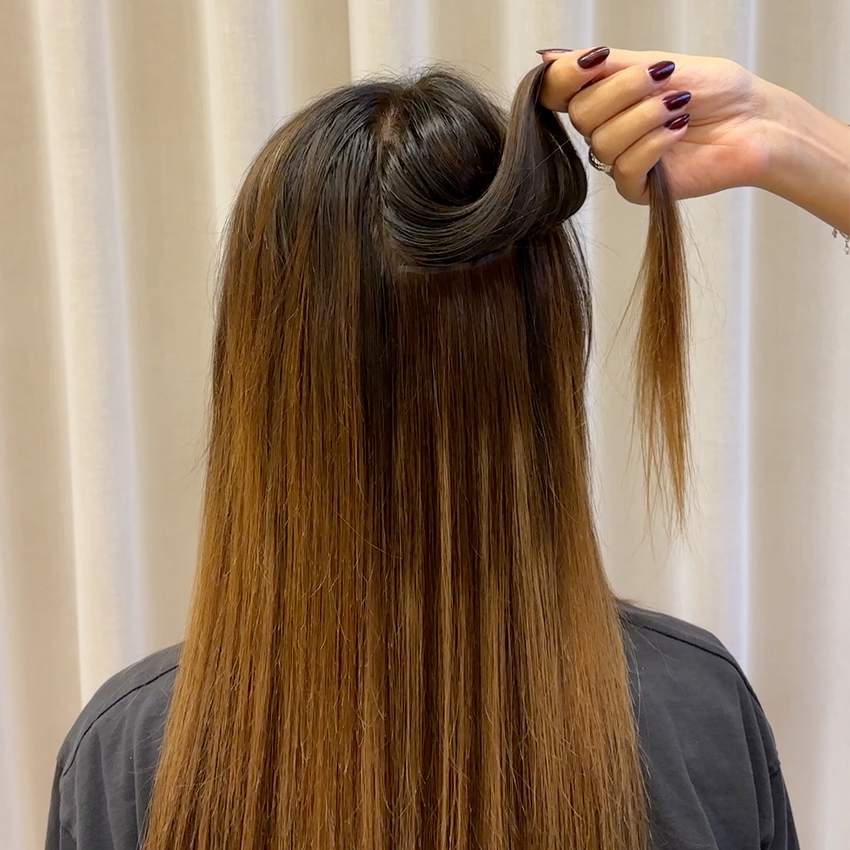Når du skal placere én eller flere tape wefts i siderne, er det vigtigt, at skilningen laves, så den skråner en smule op mod dit ansigt. Det giver nemlig et flot naturligt resultat og gør det nemmere for dig at sætte håret op.