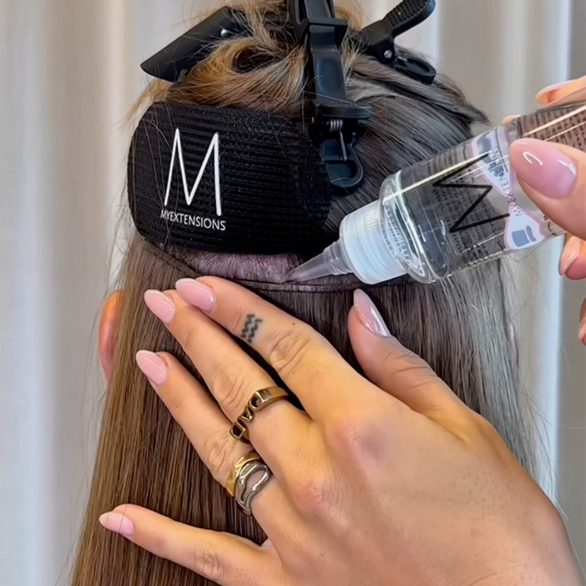 💡Vigtigt: Undgå at røre ved tapen under påsætningen, det kan nemlig ødelægge dens klæbeevne, så dine extensions glider ud.