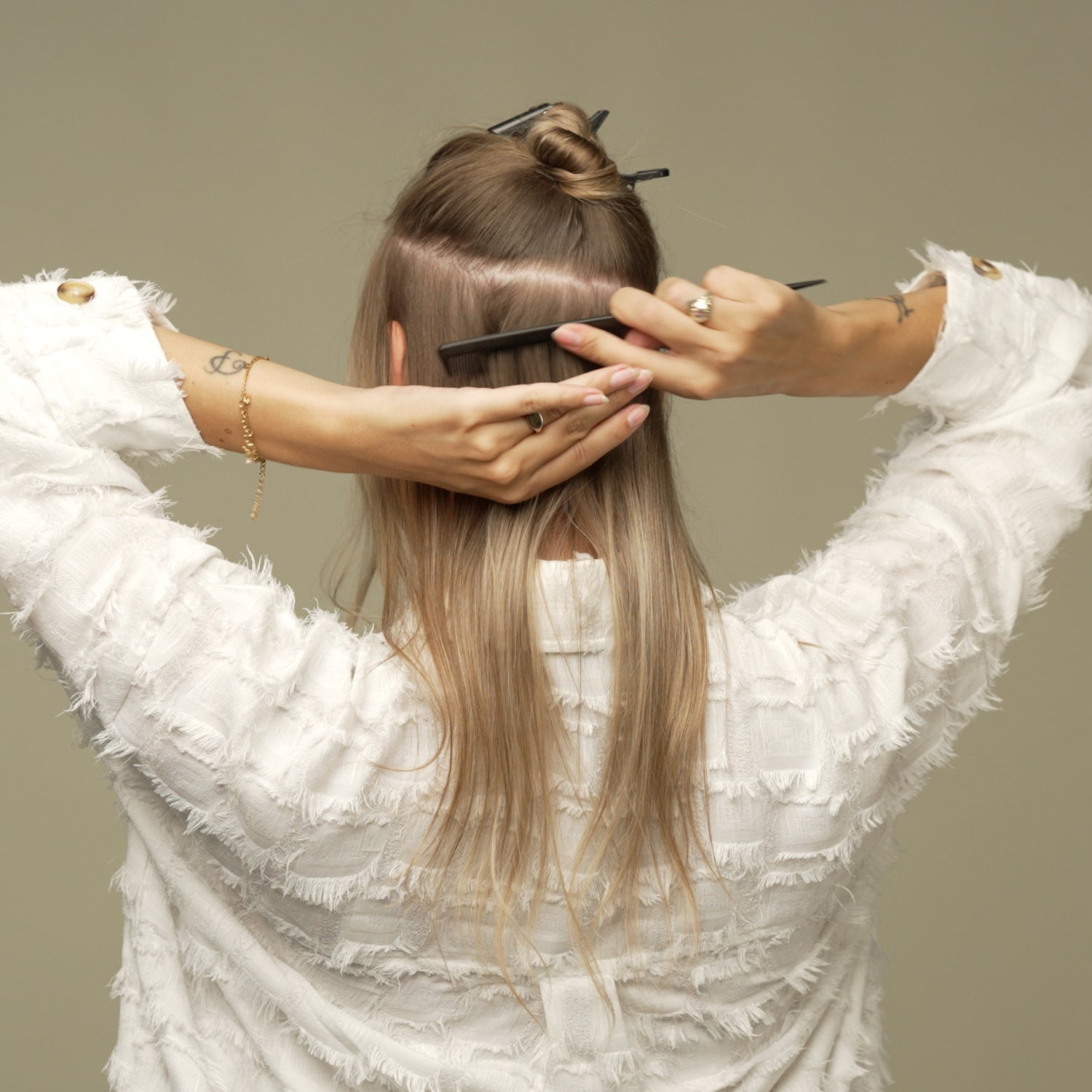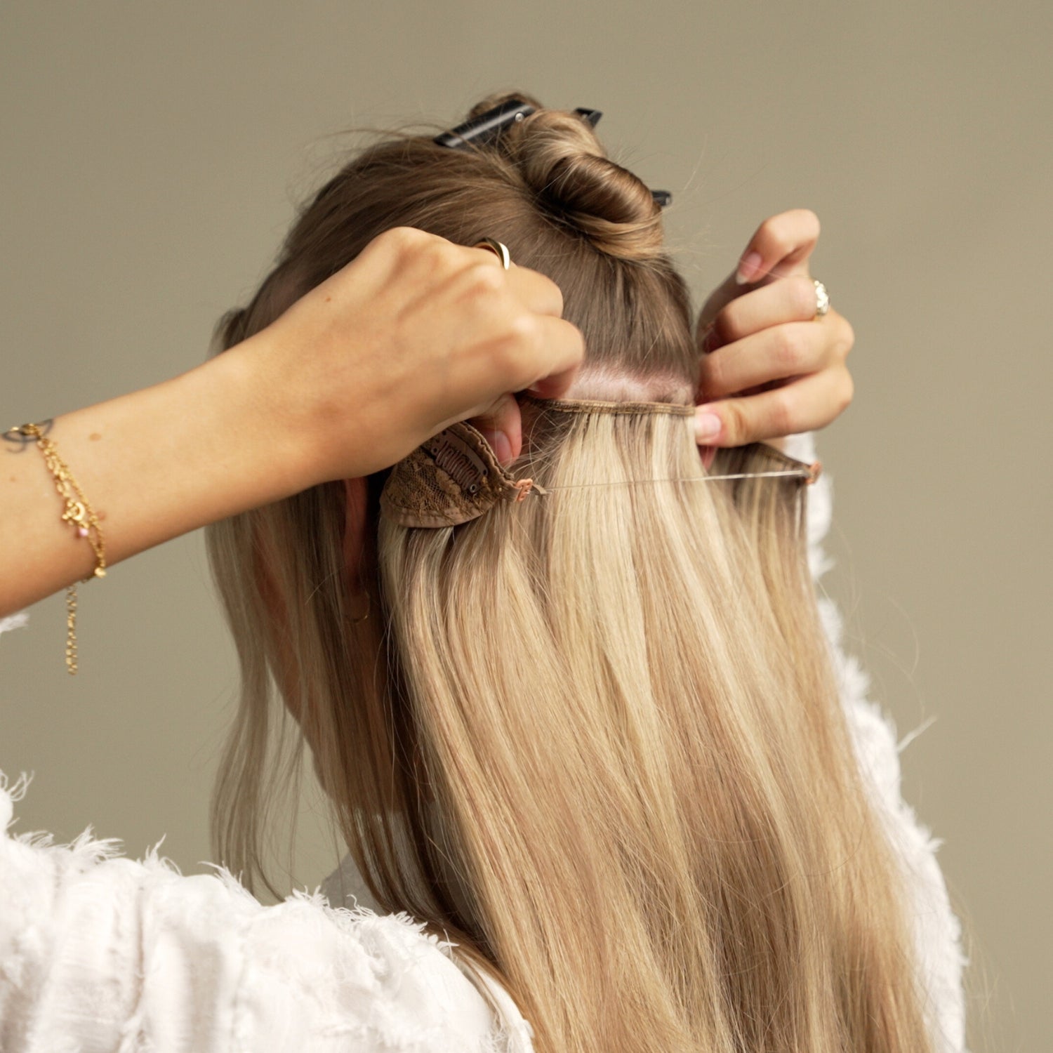 Når du har touperet håret let, er det tid til at sætte dine Halo extensions fast i dit eget hår.