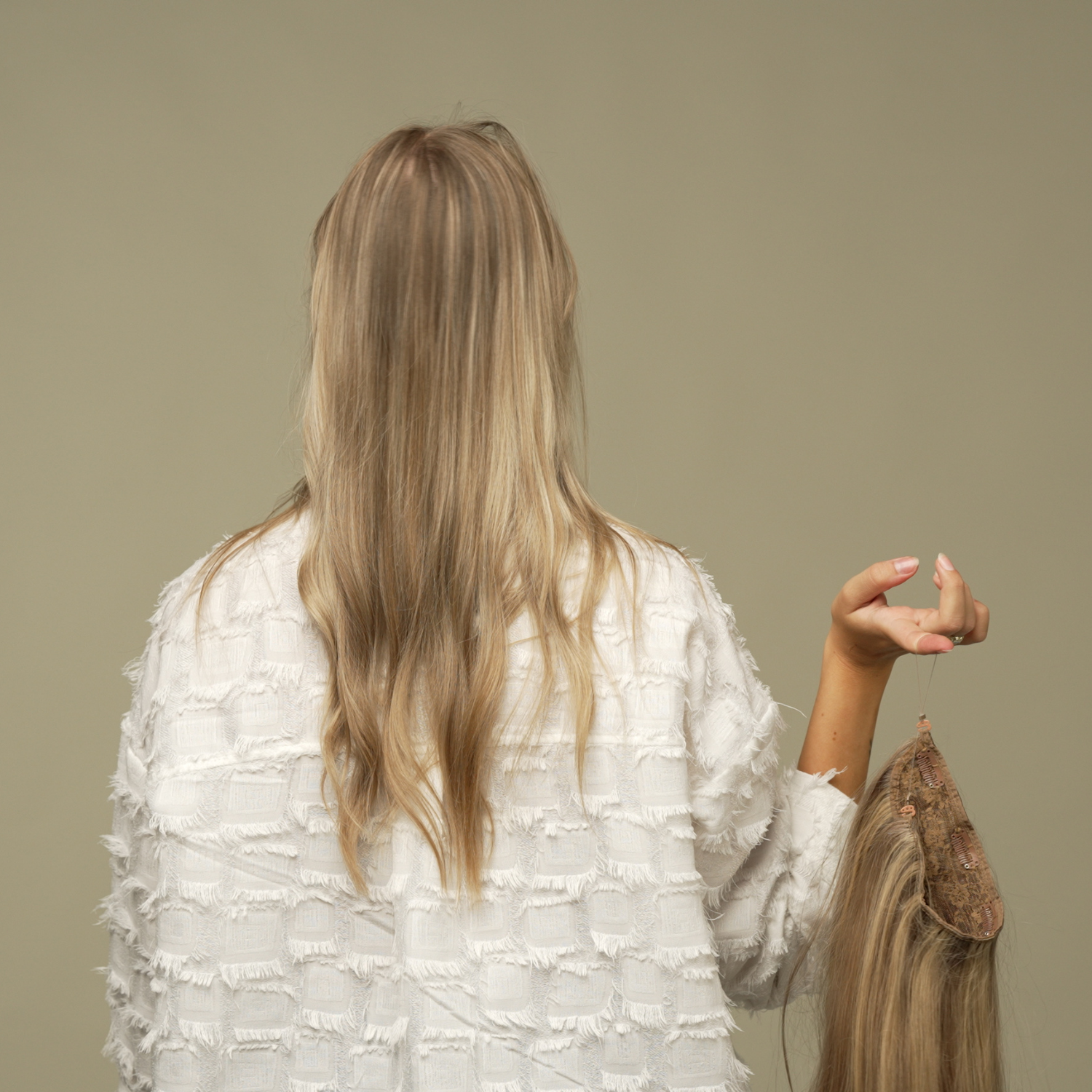 Fjern klemmen og lad dit eget hår falde ned over dine Halo extensions.