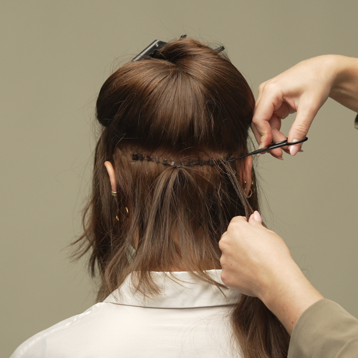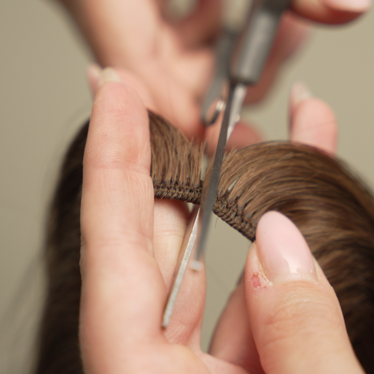 - Start med at klippe sytråden op – brug en lille saks og vær forsigtigt, når du klipper (så du ikke kommer til at klippe i hverken dit eget hår eller dine extensions)