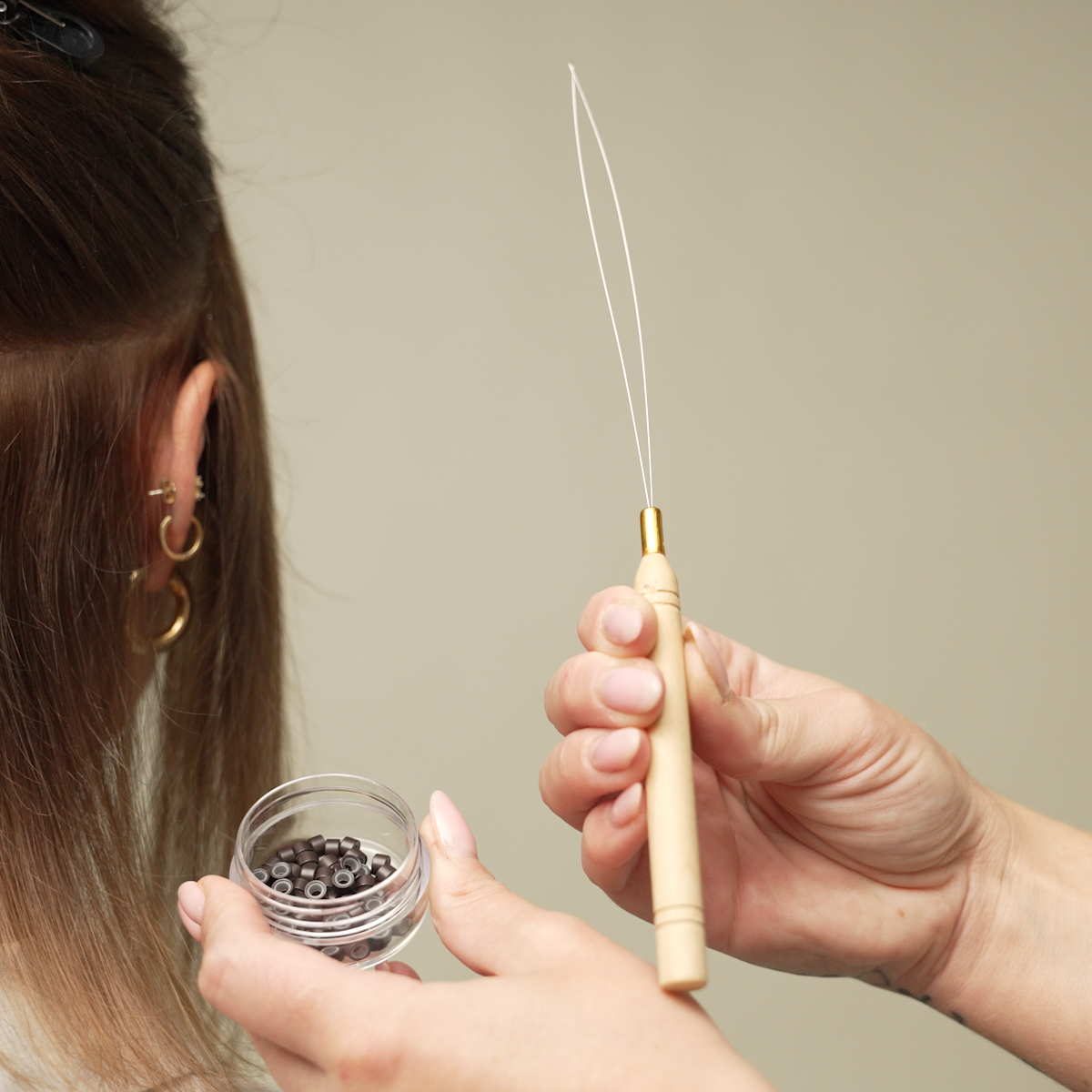 - Træk din egen tot af hår igennem cold fusion nålen, og træk micro-ringen over dit eget hår, til den sidder tæt ved din hovedbund (så tæt du kan, uden det strammer eller føles ubehageligt). Klem micro-ringen flad med din extensionstang.